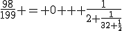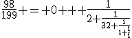 ഇല്ലെങ്കിലും ഇത്തരം സമവാക്യങ്ങള്‍ നിര്‍ദ്ധരിക്കാനുള്ള വഴികള്‍ ഗണിതജ്ഞര്‍ ആവിഷ്കരിച്ചിട്ടുണ്ടു്. അതനുസരിച്ചു്, (98/199) എന്ന ഭിന്നത്തിനെ ഒരു തുടര്‍‌ഭിന്നം (continued fraction) ആക്കുക.